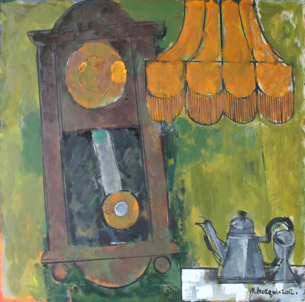 На картине изображены часы с маятником, торшер и чайник. По сравнению с другими картинами, на этой картине чувствуется движение часов, вероятно художник хотел сказать, что время «бежит»