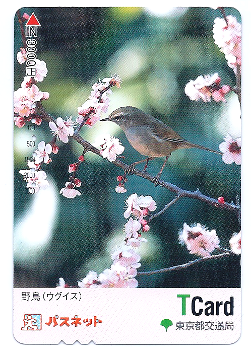 Давайте посмотрим на эту настоящую короткокрылую камышовку (ウグイス). Именно так называется небольшой представитель пернатых, сидящий на веточке цветущей сливы (возможно). Карточка принадлежит муниципальной компании-оператору токийского метрополитена Тоэй.