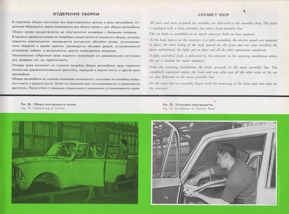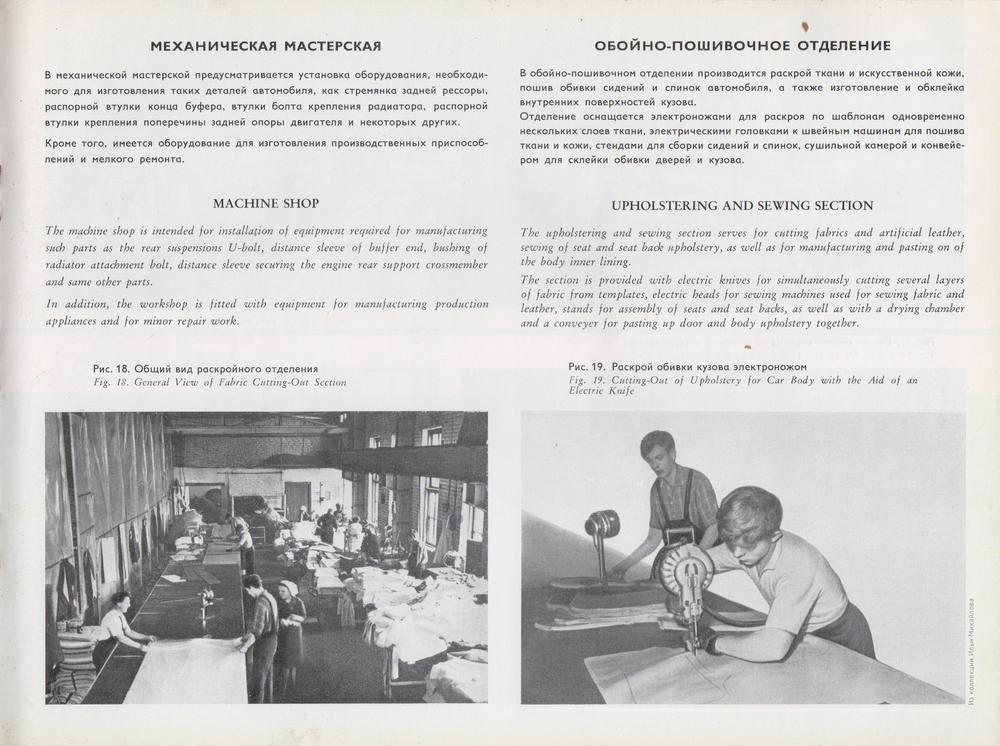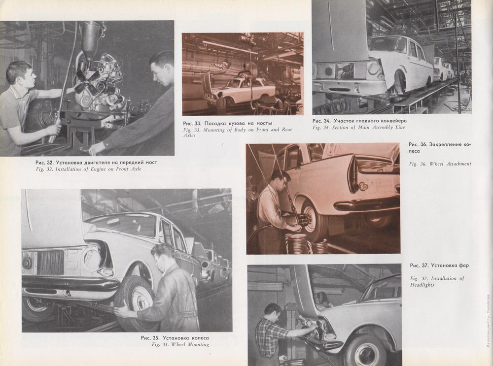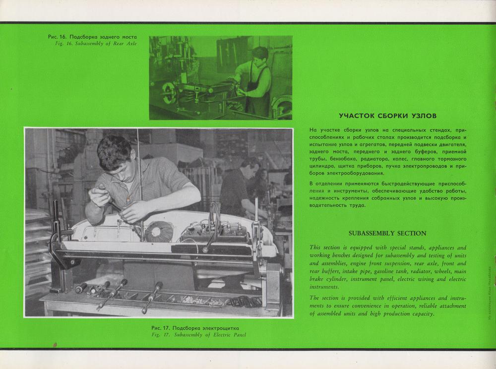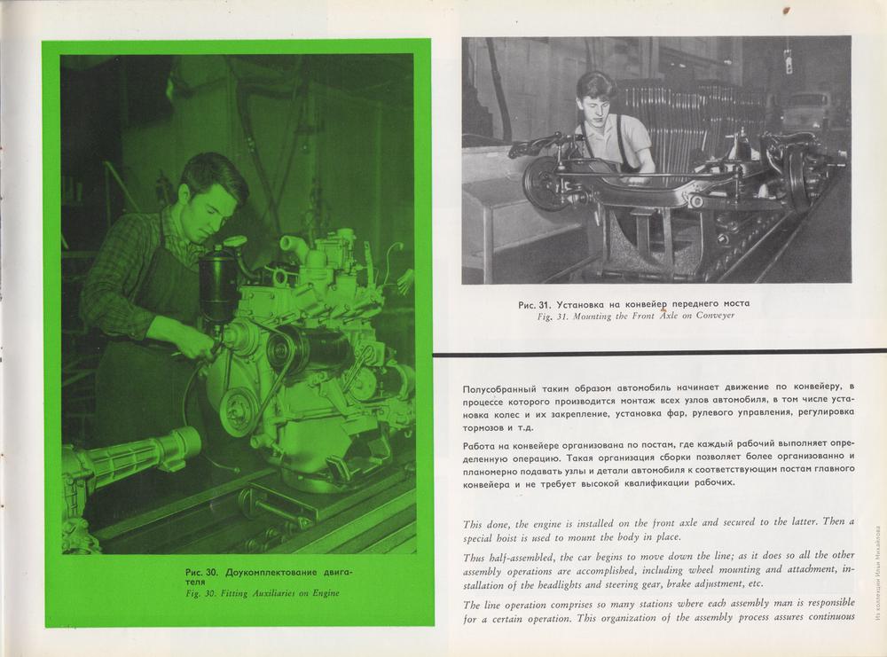 Проиллюстрирован процесс сборки авто из машинокомплектов. Комплект включает кузов с основными узлами и агрегатами. В отдельные ящики упаковываются мелкие детали и крепёж. Кузов поставляется неокрашенным, но в отрихтованном и загрунтованном виде. Двигатель — законсервирован. Хромированные и полированные детали завертываются в промасленную бумагу.