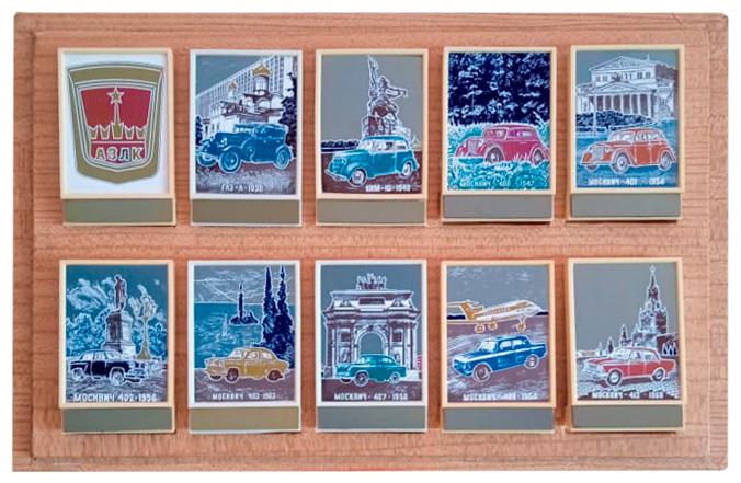 В наборе — 10 табличек с моделями от ГАЗ-А (1930 года) до Москвич-412 (1969 года). ![]()