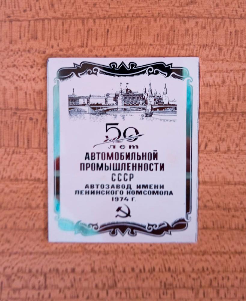 Табличка из сувенирного набора, выпущенного Автомобильным заводом им. Ленинского комсомола к 50-летию автомобильной промышленности СССР в 1974 году.