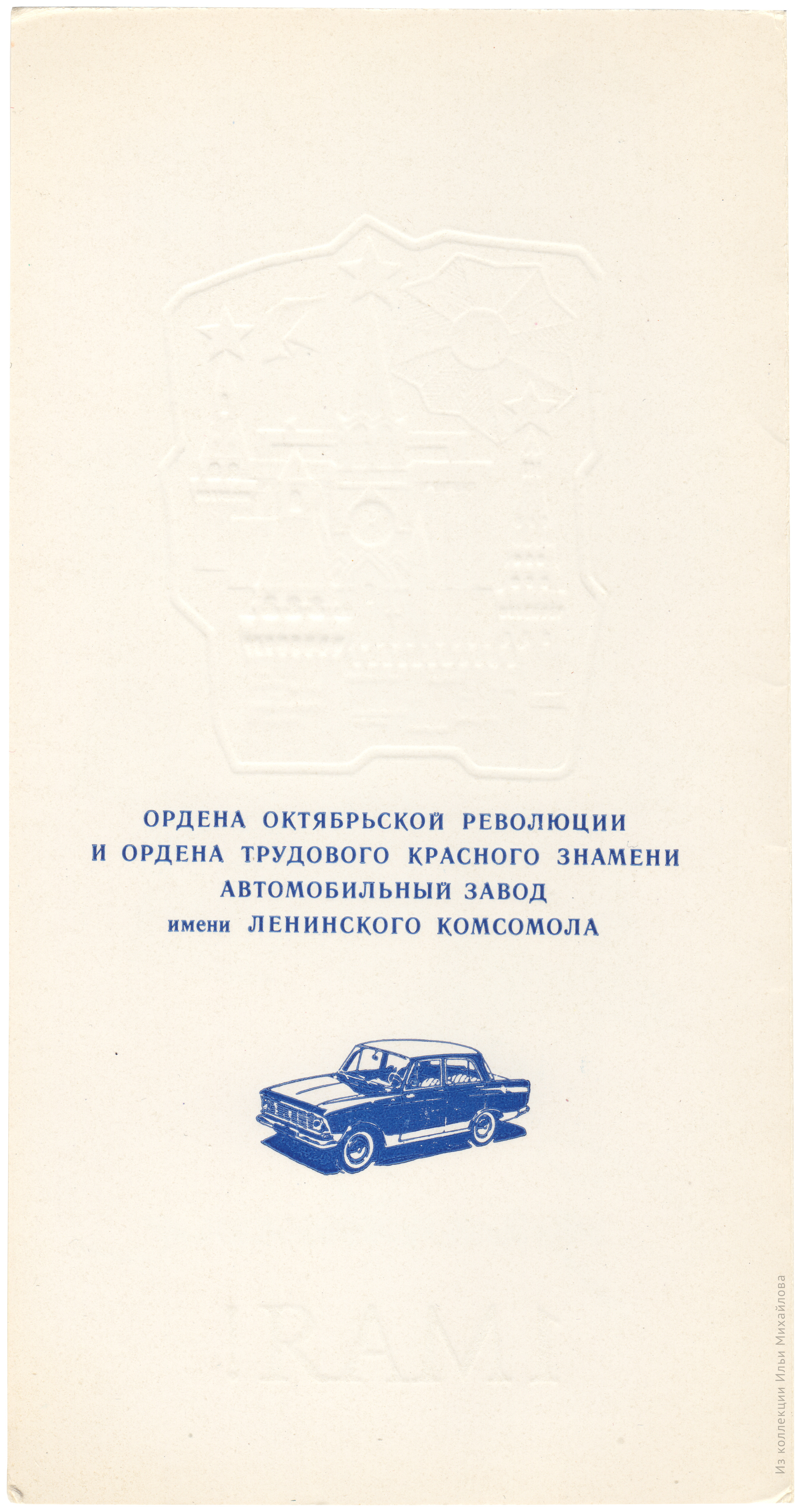 Поздравительная первомайская открытка от ордена Октябрьской Революции и ордена Трудового Красного Знамени Автомобильного завода имени Ленинского комсомола.