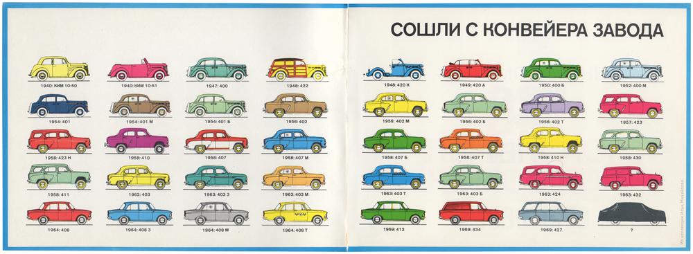 Модельный ряд автомобилей завода от КИМ 10-50 (1940 г) до Москвич-427 (1969 г).