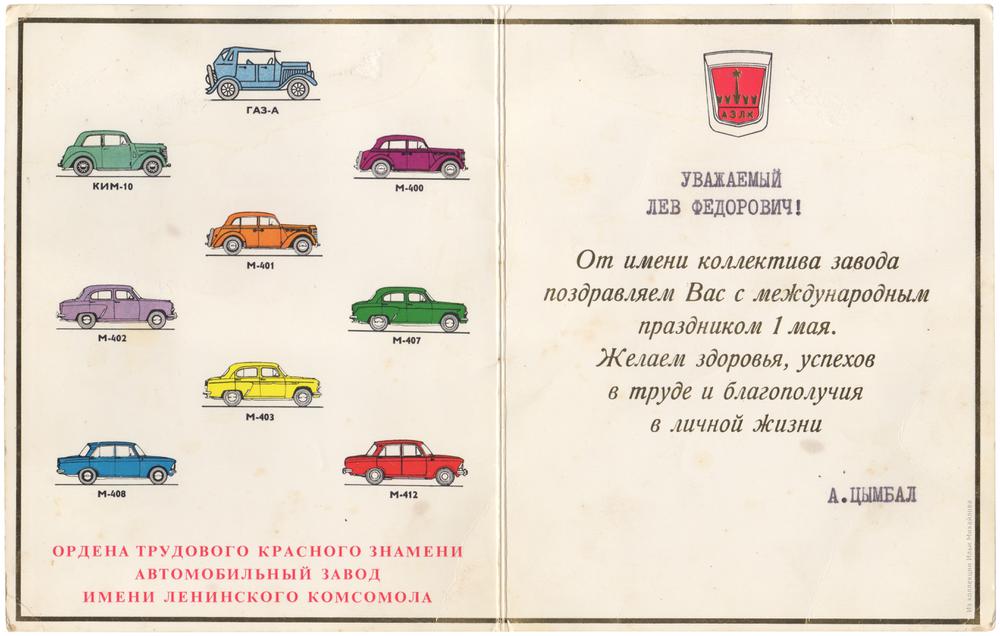 Поздравительная первомайская открытка от ордена Трудового Красного Знамени Автомобильного завода имени Ленинского комсомола.