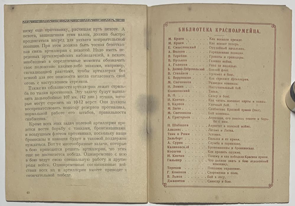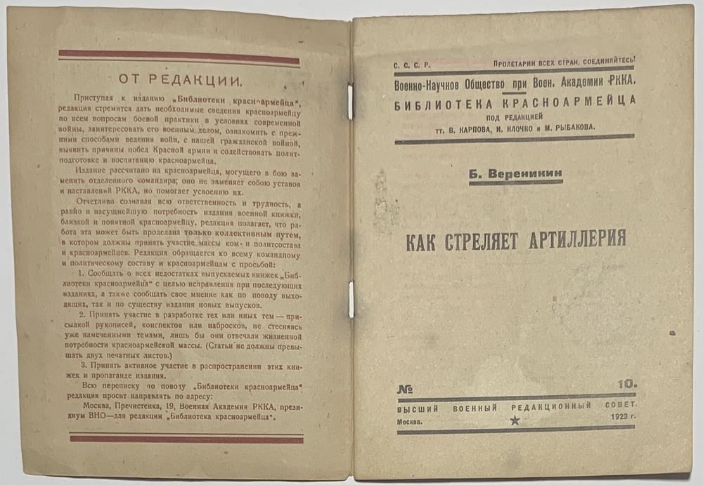 Приступая к изданию `Библиотеки красноармейца`, редакция стремится дать необходимые сведения красноармейцу по всем вопросам боевой практики в условиях современной войны, заинтересовать его военным делом, ознакомить с прежними способами ведения войн, с нашей гражданской войной, выявить причины побед Красной армии и содействовать полит-подготовке и воспитанию красноармейца.