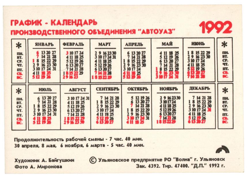 График-календарь ПО «АвтоУАЗ» на 1992 год